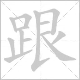 跟 (предлог, гл.) gēn (вместе) с; идти с, следовать за