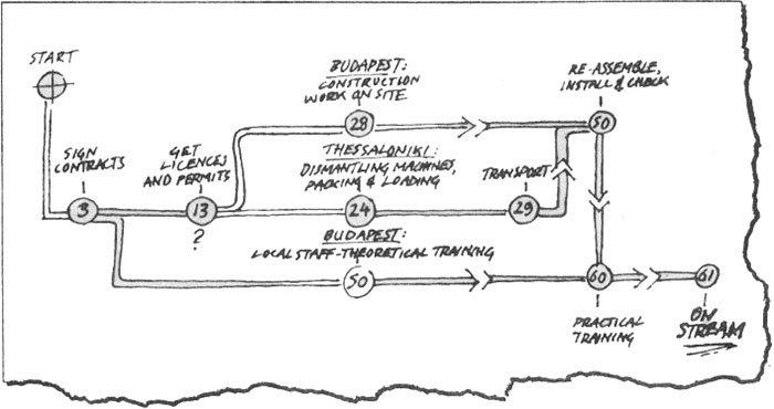 | TIBOR | Look, I'll draw you a critical path analysis diagram for the installation of the recycling plant. ![]() |
