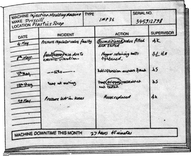 This is the logbook for the injection moulding machine. Read it carefully. Then listen as Yukio telephones Frank Parkwich, the Works Manager