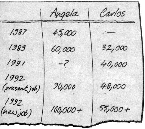 | JOE | Considering the field she's in, 90K isn't all that great. She was getting 45K in Britain five years ago. It's taken her five years to double her earnings. What really bothers me, though, is that her experience has been totally in the area of finance and banking. |