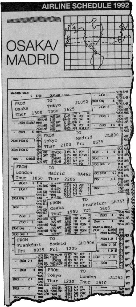 | CARLOS | But that's even later than if I go Tokyo-Madrid! What time would I get to Madrid? |