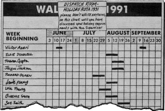 This is part of the Dispatch Room holiday chart. In the left-hand column are the names of the staff. Study this chart. You will need to refer to it for 6.6.