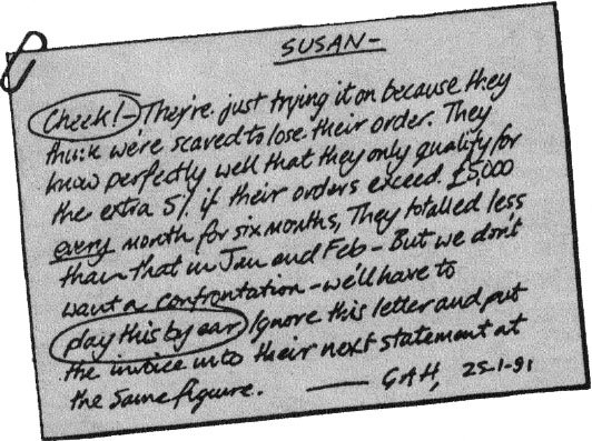 | SUSAN | Oh no! It'll have to go back. All our tape dispensers are two centimetres wide. Check it, will you, Ben? If it is the wrong stuff , make out a returns slip and ask them to replace the tape as soon as they can. And in the meantime we'll expect a credit note from them. ![]() |