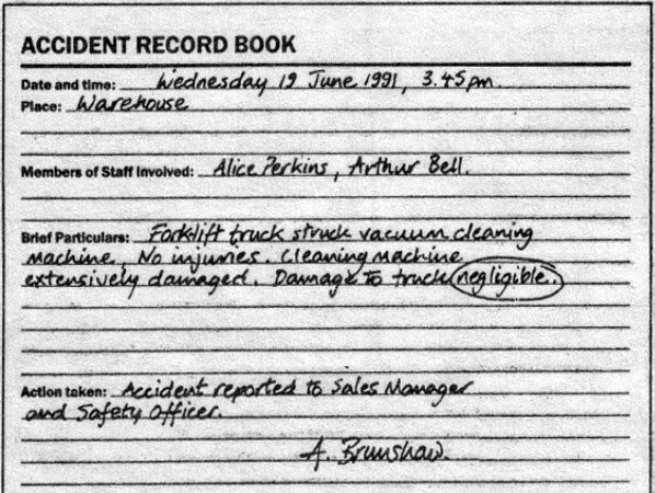 The next day, Bookmart's Safety Officer is investigating the warehouse accident. He must complete one of the company's standard accident report forms for the General Manager. Write down as many of the details as you can.