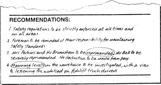 | 4 | 'The gangways between the racks in the stockroom aren't as wide as the Health and Safety Regulations say they should be.' |