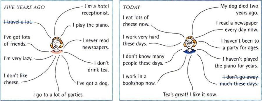 Five years ago: I travel a lot. — I’ve got lots of friends. — I’m very lazy. — I don’t like cheese. — I’m a hotel receptionist. — I play the piano. — I never read newspapers. — I don’t drink tea. — I’ve got a dog. — I go to a lot of parties.