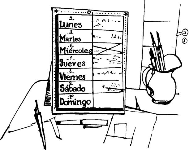 Entra María, la amiga de Juana. Sobre la mesa hay un calendario. María lee. Lunes: la costurera. Martes: vamos a ver a los abuelos. Miércoles: al cine con Juan. Jueves: vamos todos a casa de los tíos. Viernes: al concierto con Juan. Sábado: ayudo a papá y mamá en casa. Domingo: con Juan al teatro, a ver la comedia „Casa con dos puertas” de Calderón. Подсказка