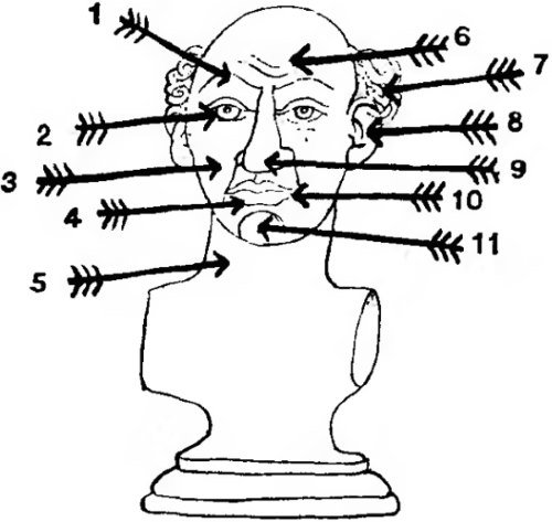 1. supercilium, i; 2. ocŭlus, i; 3. gena, ae; 4. labrum, i; 5. collum, i; 6. frons, frontis; 7. capilli, ōrum; crines; 8. auris, auris; 9. nasus, i; 10. os, oris; 11. mentum, i.