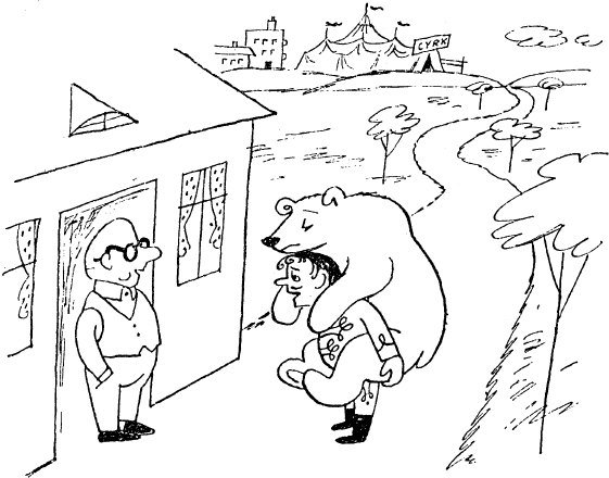 | 45. | — | Chwileczkę, obywatelu, spojrzę na plan miasta... To niedaleko stąd. Mogą państwo na tym przystanku wsiąść do setki. Wysiąść należy na drugim przystanku. | ![]() |